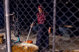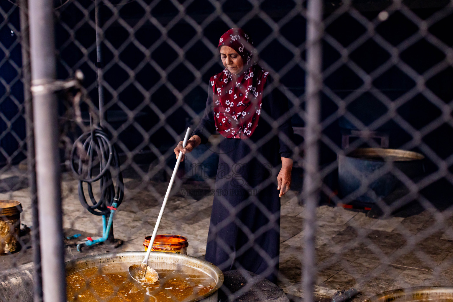 Woman stirring boiling tuna stock during rihaakuru production in Dhiggaru.