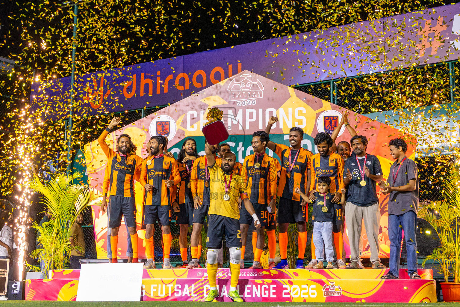 JJ Sports Club vs FC Calms in the final of BG Futsal Challenge 2026 was held in BG Futsal Ground on Thursday, 12th March 2026, in Male', Maldives Photos: Nausham Waheed , Ismail Thoriq / images.mv