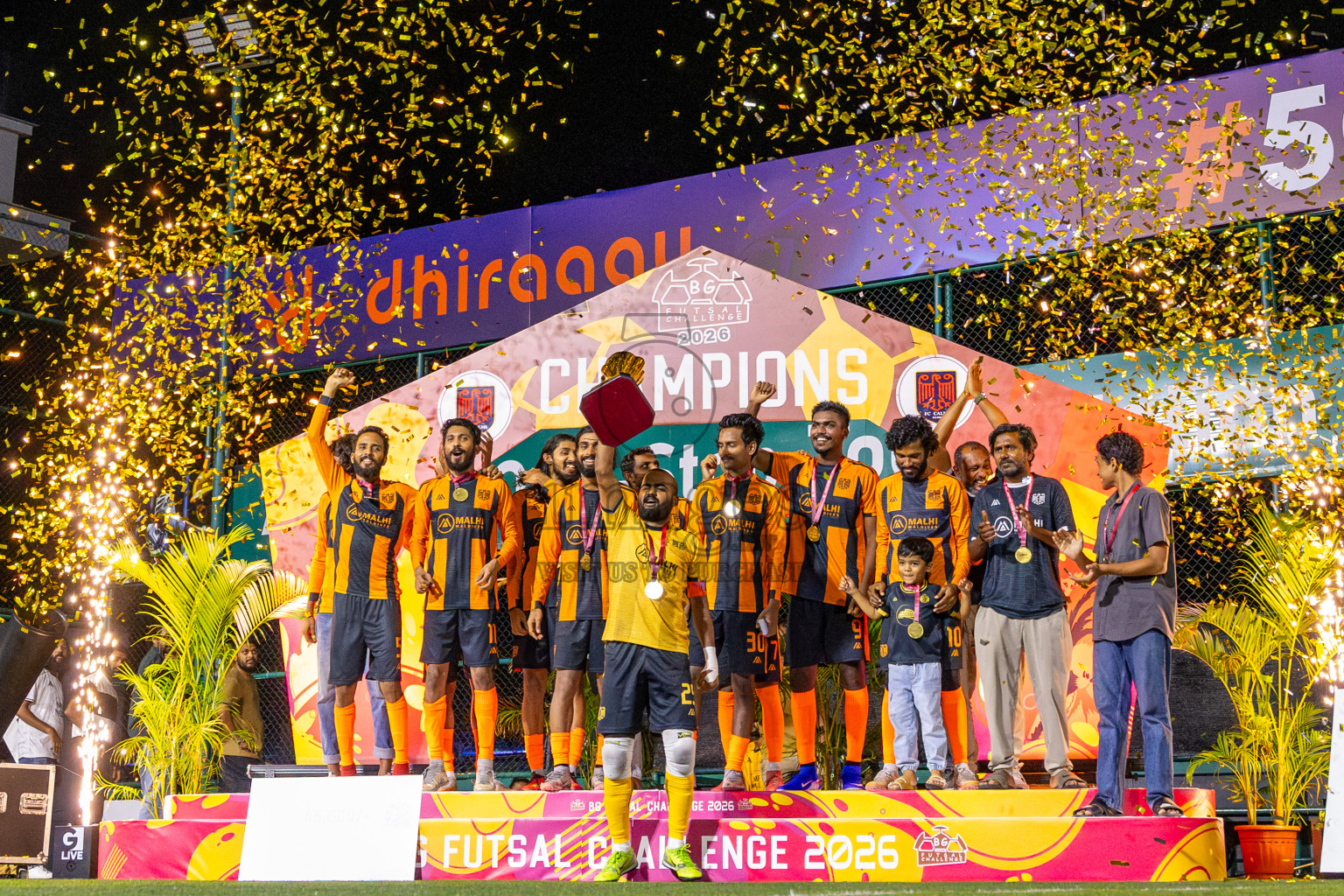 JJ Sports Club vs FC Calms in the final of BG Futsal Challenge 2026 was held in BG Futsal Ground on Thursday, 12th March 2026, in Male', Maldives Photos: Nausham Waheed , Ismail Thoriq / images.mv