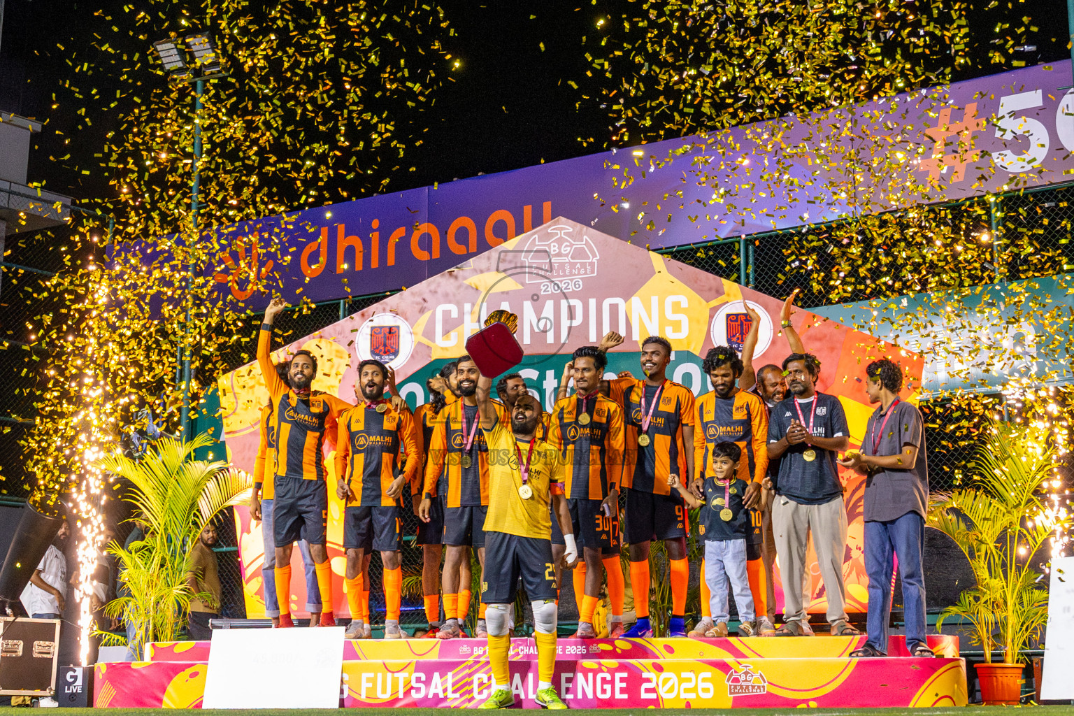 JJ Sports Club vs FC Calms in the final of BG Futsal Challenge 2026 was held in BG Futsal Ground on Thursday, 12th March 2026, in Male', Maldives Photos: Nausham Waheed , Ismail Thoriq / images.mv