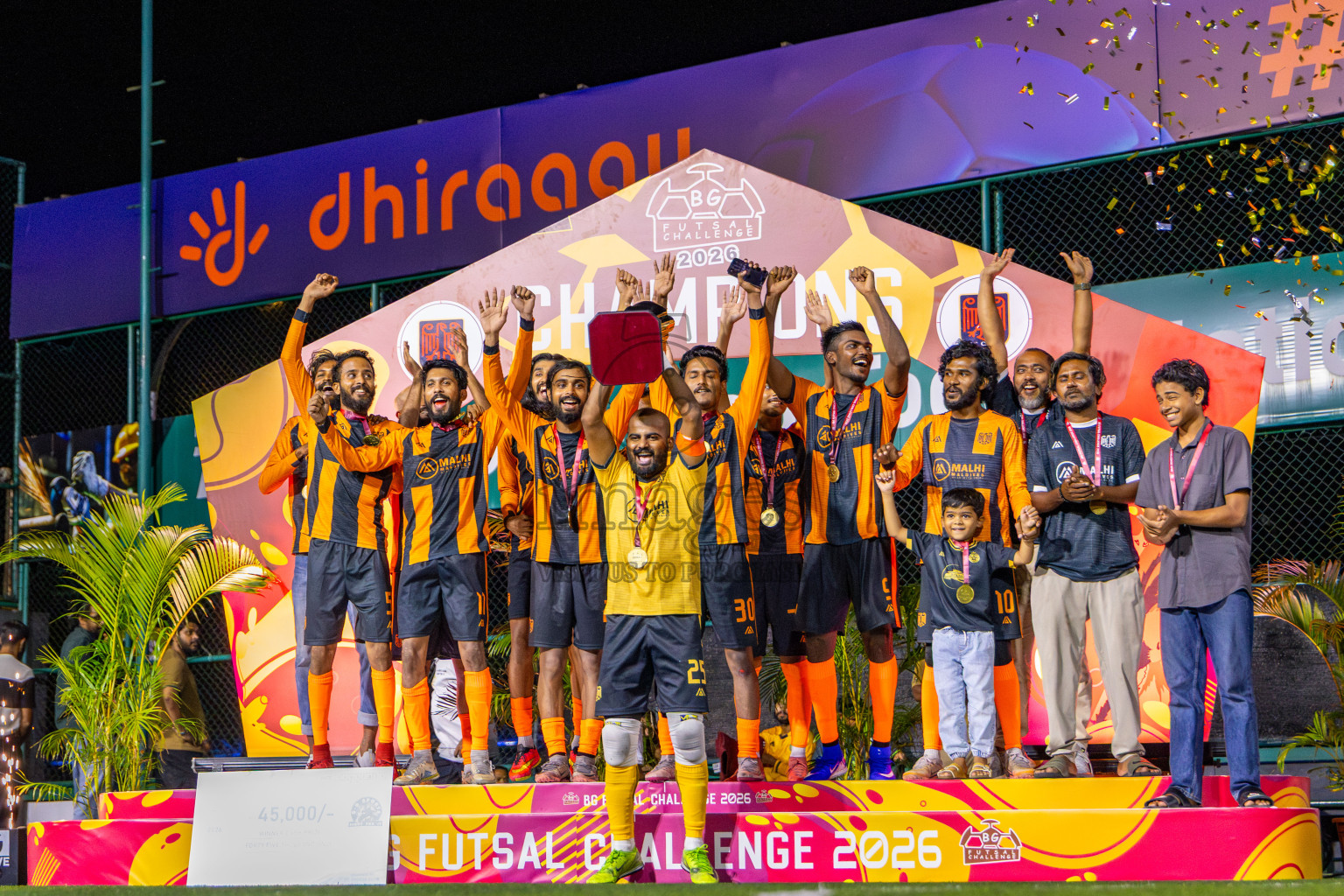 JJ Sports Club vs FC Calms in the final of BG Futsal Challenge 2026 was held in BG Futsal Ground on Thursday, 12th March 2026, in Male', Maldives Photos: Nausham Waheed , Ismail Thoriq / images.mv